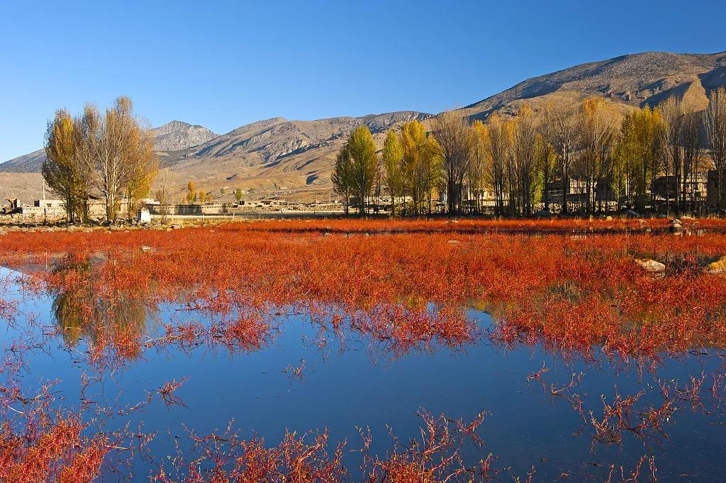 早上從稻城出發(fā),前往桑堆的途中可以停留拍攝紅草地(該景點(diǎn)為季節(jié)性景觀,只有在每年的九月中旬到十一月上旬才能看到紅草),在秋天的時候,配合上后面泛黃的樺樹,倒映在水塘中,是非常漂亮的一道美景;