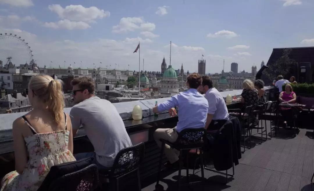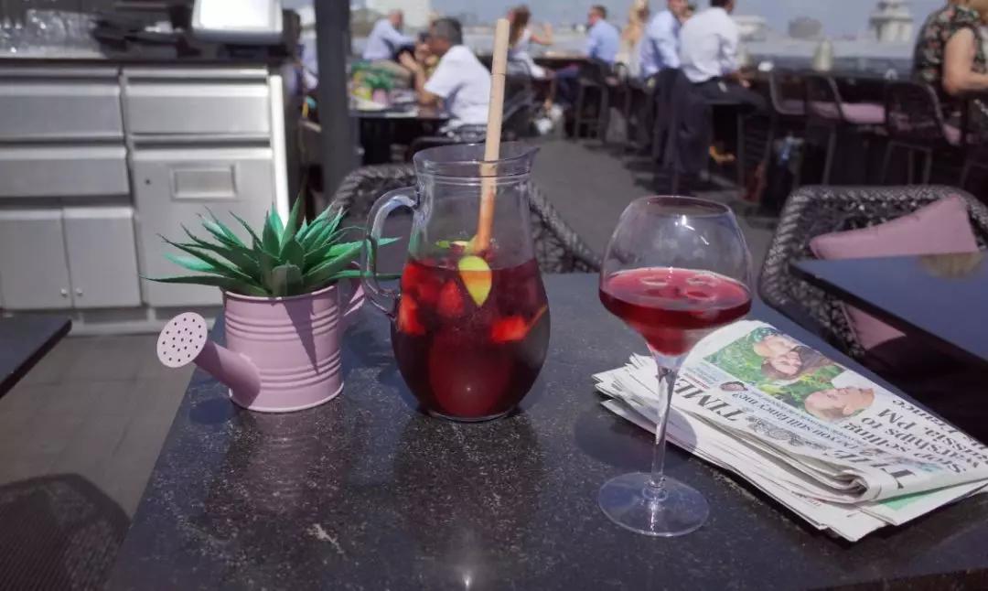 這家酒吧屬于Trafalgar Hotel 內(nèi)部的屋頂酒吧,最有名的點(diǎn)是因?yàn)樗驮谔乩訌V場(Trafalgar Square) 正旁邊,所以邊喝酒可以邊看著廣場的車水馬龍與人們,另一面則看得倫敦眼。這間屋頂酒吧只有在春夏季節(jié)時(shí)才啟用,入場也是從飯店大聽坐電梯上樓,常常到下午會(huì)人潮爆滿的情況,而且四點(diǎn)后會(huì)收入場費(fèi)£5,自己要抓一下時(shí)間。之前跟哥們來常常會(huì)點(diǎn)一壺Sangria 喝酒聊天曬太陽,非常愜意。