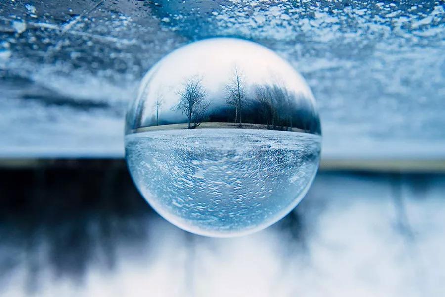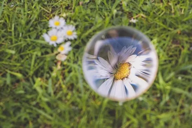 使用水晶球進行聚焦,不僅可以實現(xiàn)放大,還可以利用畸變來使紋理產(chǎn)生一定的變化感;再利用小/清晰虛像與大/模糊實景的對比,會讓作品顯得更有趣。