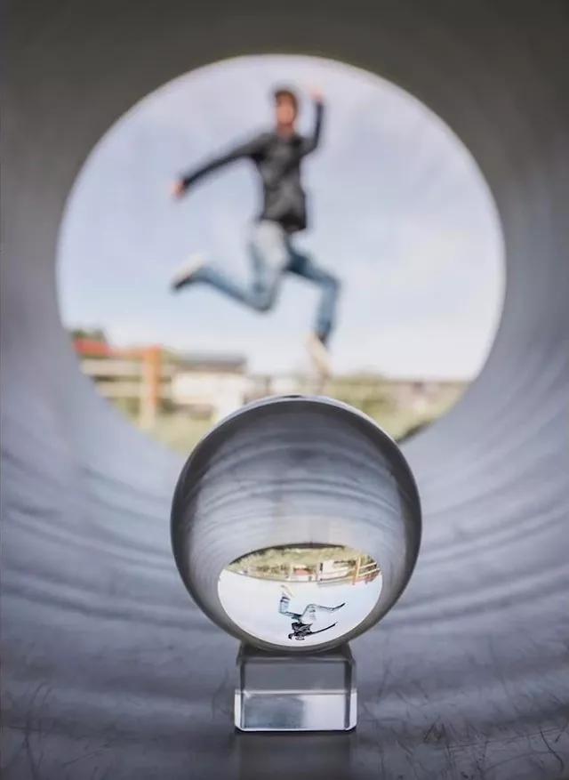 和其它需要大光圈虛化背景的玩法不同,這一玩法需要使用小光圈,讓整個畫面都清晰,使球內(nèi)倒錯的線條、圖案和現(xiàn)實場景中圖案對應(yīng)起來。