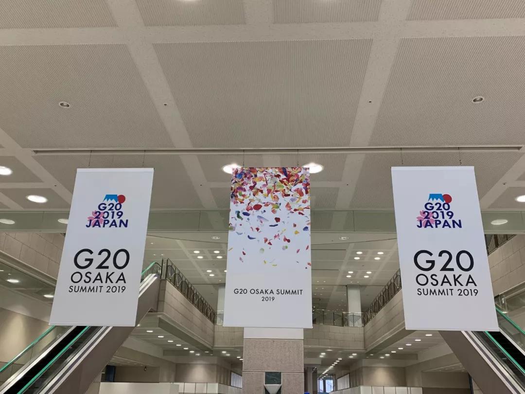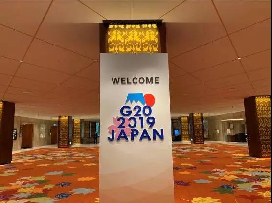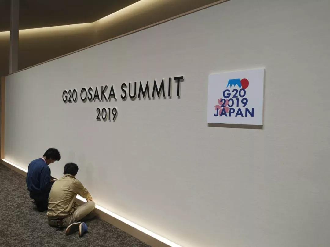 大阪麗嘉皇家酒店內(nèi),帶有二十國集團領(lǐng)導(dǎo)人大阪峰會會標(biāo)的迎賓牌格外醒目。