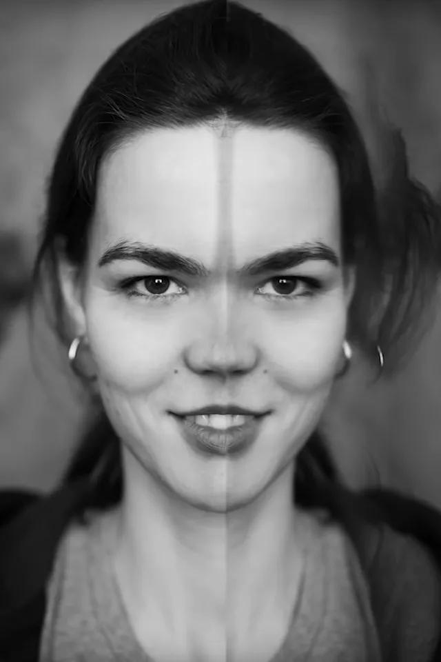你也可以另辟蹊徑,不追求完美對稱——讓鏡面和臉部對稱軸重合,轉而在特殊的地方創(chuàng)造對稱面,同樣能收獲很有趣的照片:
