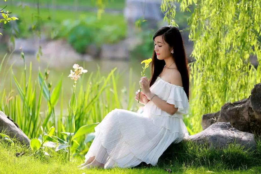 (2)如果想讓前景更加虛化:可以用一些樹(shù)葉,遮在鏡頭前,形成虛化的前景。但是,不要讓前景,把模特兩只眼睛都遮住。