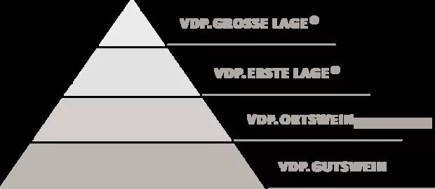 VDP酒莊使用著一套與德國官方葡萄酒分級同時存在,卻又完全獨(dú)立的分級系統(tǒng)。眾所周知,1971年頒布的德國官方葡萄酒分級以葡萄成熟度為標(biāo)準(zhǔn),但這個標(biāo)準(zhǔn)過于片面,難以區(qū)分酒的真實品質(zhì)。為了解決這個問題,VDP建立了聯(lián)盟內(nèi)部的分級制度,最新的分級制度更新于2012年,以勃艮第的風(fēng)土理念為出發(fā)點(diǎn):