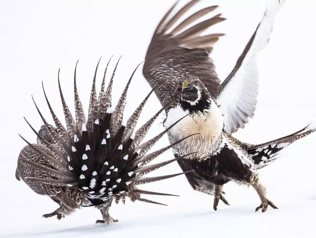 照片背后的故事:“我用了很多個(gè)春天寒冷的早晨來拍攝大艾草松雞求偶的場景。一開始,照片中的這兩只競爭者肩并肩地坐在一起,突然之間,它們仿佛收到了某種暗號(hào),開始用翅膀向?qū)Ψ桨l(fā)起攻擊。這張?jiān)趫?jiān)硬的積雪地上抓到的照片,展示了大艾草松雞為了求偶打架時(shí)的力量?!?/span>