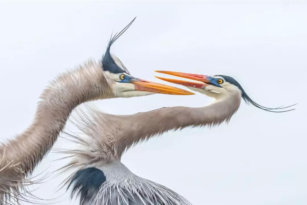 照片背后的故事:“在我抵達(dá)我最喜歡的濕地時(shí),一場暴風(fēng)雨在這群大藍(lán)鷺中正蓄勢待發(fā)。這個(gè)場景一下子抓住了我的注意力:一只雄性大藍(lán)鷺,明顯想要引誘雌性大藍(lán)鷺,正在雌性面前伸展自己的身體。