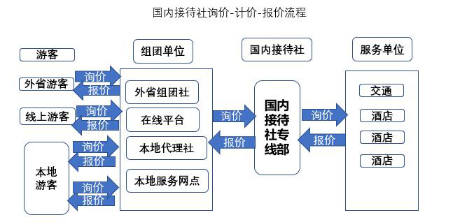報(bào)價(jià)就有三種情況,一是接待社專(zhuān)線部給外省組團(tuán)社專(zhuān)線部報(bào)價(jià),專(zhuān)線部在向外省組團(tuán)社服務(wù)網(wǎng)點(diǎn)報(bào)價(jià),外省服務(wù)網(wǎng)點(diǎn)在向外省游客報(bào)價(jià)。二是接待社專(zhuān)線部給本地服務(wù)網(wǎng)點(diǎn)、本地代理商報(bào)價(jià),服務(wù)網(wǎng)點(diǎn)和代理商再向本地游客報(bào)價(jià)。三是接待社專(zhuān)線給在線平臺(tái)報(bào)價(jià),在線平臺(tái)給在線游客報(bào)價(jià)。