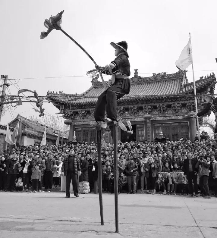 當(dāng)我們所處的拍攝環(huán)境比較雜亂時(shí),就可以利用黑白攝影來淡化。比如下面這張攝影作品,攝影師想要突出的主體是踩高蹺的表演者,但是周圍圍觀的人以及建筑物作為陪襯體又不能舍棄,只能利用黑白攝影淡化周圍環(huán)境的色彩來突出主體。