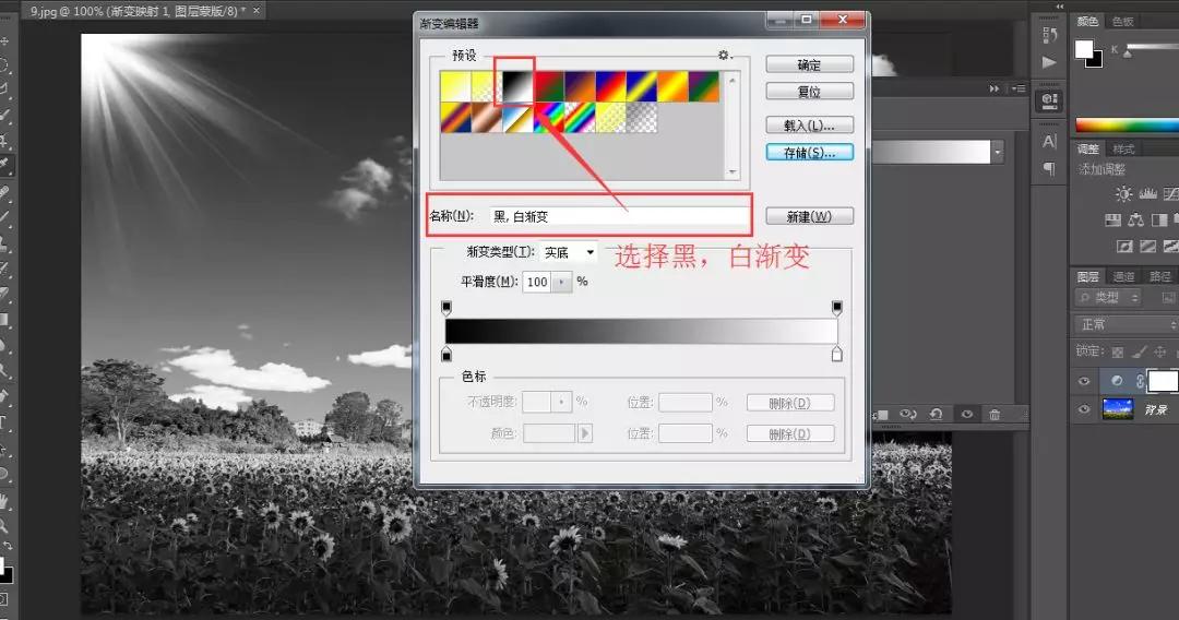 圖片導(dǎo)入進(jìn)來之后,點(diǎn)擊右下角半黑半白的圓形圖標(biāo)——選擇漸變映射——雙擊漸變條——選擇“黑,白漸變”確定即可。