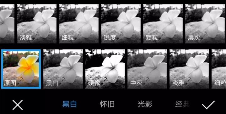 不會(huì)使用Photoshop也沒關(guān)系,手機(jī)自帶的美顏相機(jī)也有這項(xiàng)功能,找到“濾鏡”——“黑白”即可。