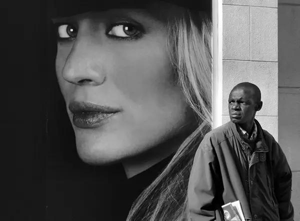 突出被攝主題的一個(gè)有效方法是讓它的尺寸看起來(lái)不太一樣,上面這張照片巨幅廣告里的女主角比實(shí)際生活中的男主角要大的多,對(duì)比起來(lái),那個(gè)在角落里的黑人男性是那么卑微。