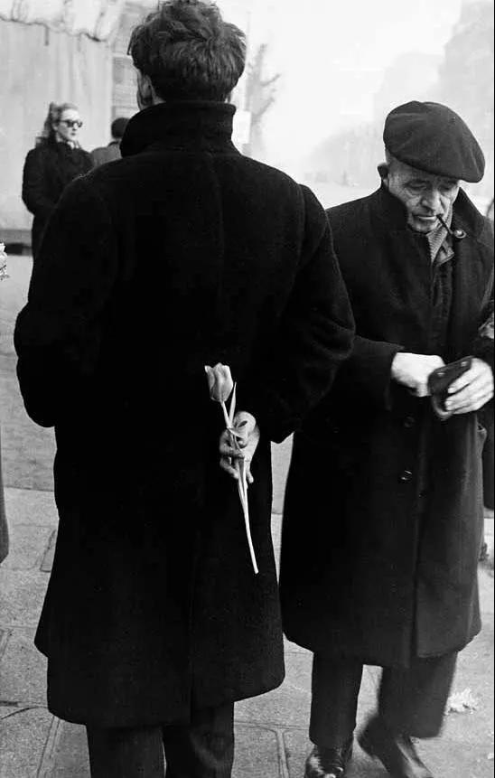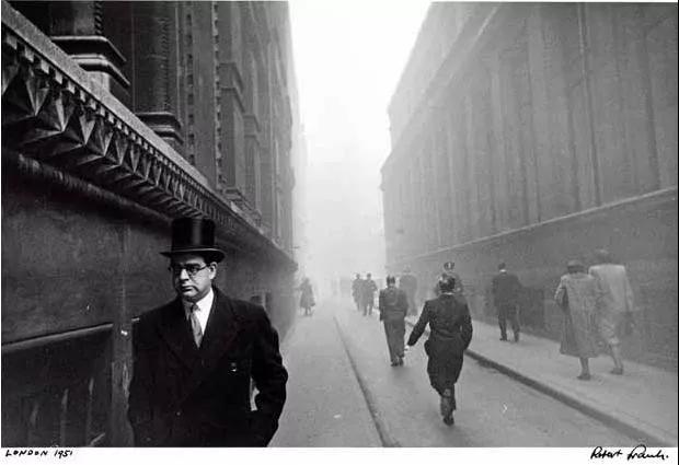 返回紐約后, 1949~1953 年期間,弗蘭克又多次前往歐洲各國,先是拍攝花都巴黎,制作了一本以鮮花為主題的影集,送給他的未婚妻;后來拍攝了英國倫敦濃霧中銀行家頭戴圓頂禮帽、身著大衣、手持雨傘或手杖來去匆匆的典型英國人形象,以及滿臉漆黑的威爾士礦工辛苦勞動的照片;在西班牙他捕捉到一頭背插匕首的牛面對斗牛士的精彩畫面。他在每座城市都尋找最有代表性的意象,通過片斷的、稍縱即逝和內(nèi)省的個人化影像,并將它們作為一個整體,共同表達(dá)他對該城市的感受。