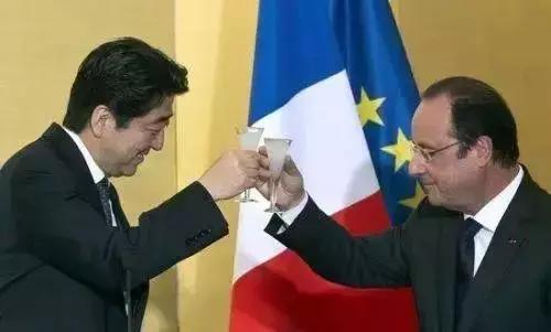 ▲ 在2014年的一場宣傳日本料理的活動上,日本首相安倍晉三和法國前總統(tǒng)奧朗德品嘗日本清酒