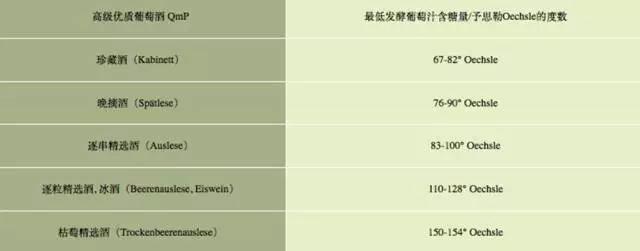 其最低含糖量的標(biāo)準(zhǔn)用予思勒(Oechsle)來表示,一度予思勒表明一升葡萄汁比一升水重一克,具體標(biāo)準(zhǔn)如下(其范圍是因?yàn)楦鳟a(chǎn)區(qū)標(biāo)準(zhǔn)不一):