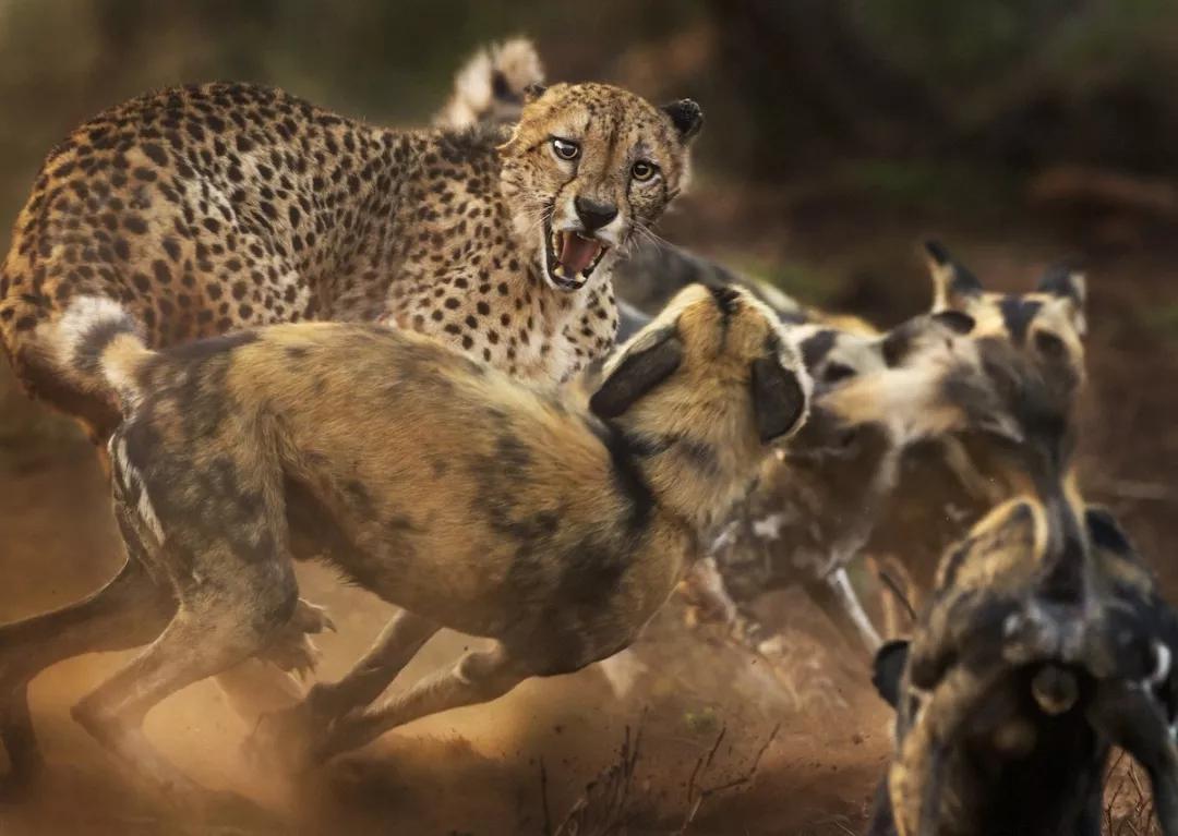 這只上了年紀的獵豹發(fā)出一邊發(fā)出“嘶嘶”地叫聲,一邊蓄力向這群野狗發(fā)起攻擊,它的左耳在打斗中被咬破,右耳在喧鬧的聲中緊緊壓下。攝影師 Peter 的鏡頭緊緊地跟著獵豹的臉,拍下了這場罕見的相遇。(由于棲息地的流失和被破壞,這兩個物種都已經(jīng)從他們大部分曾經(jīng)的棲息地中消失。)