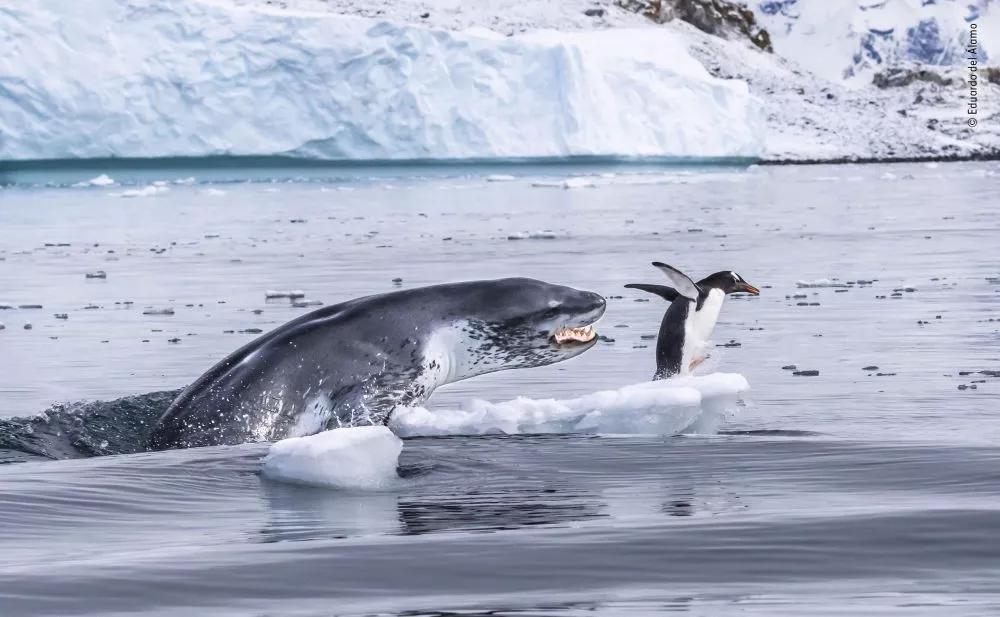 一只巴布亞企鵝正在一塊碎冰上小憩,突然間一只豹海豹從水面中沖出,長著大嘴,攻向這只企鵝。巴布亞企鵝已經(jīng)是企鵝屆中游泳速度最快的選手了,它慌忙從碎冰上逃脫,但是在后面不慌不忙追趕的豹海豹此時似乎已經(jīng)將這場捕獵當成了自己的游戲。