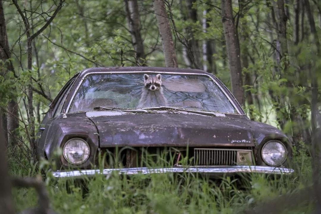 傍晚時分,在加拿大薩斯喀徹溫省的一個廢棄農(nóng)場里,一只浣熊將頭從一輛二十世紀七十年代福特的擋風玻璃的碎洞中探出,而后座上正坐著它五個興奮的孩子。這位浣熊母親將頭探出后,仔細觀察了周圍環(huán)境很久,在確定安全以后,它趁著夜色鉆出了這輛車去為孩子們尋找食物。
