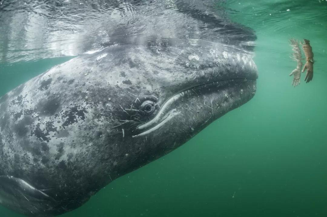 一頭好奇的灰鯨正在游向一位游客從水面游覽艇上伸下來的手。墨西哥下加利福尼亞半島中部地區(qū)圣伊格納西奧湖,灰鯨母親和她們的孩子們都會很積極的尋求和人類的接觸,讓人們撓一下自己的頭或者后背。
