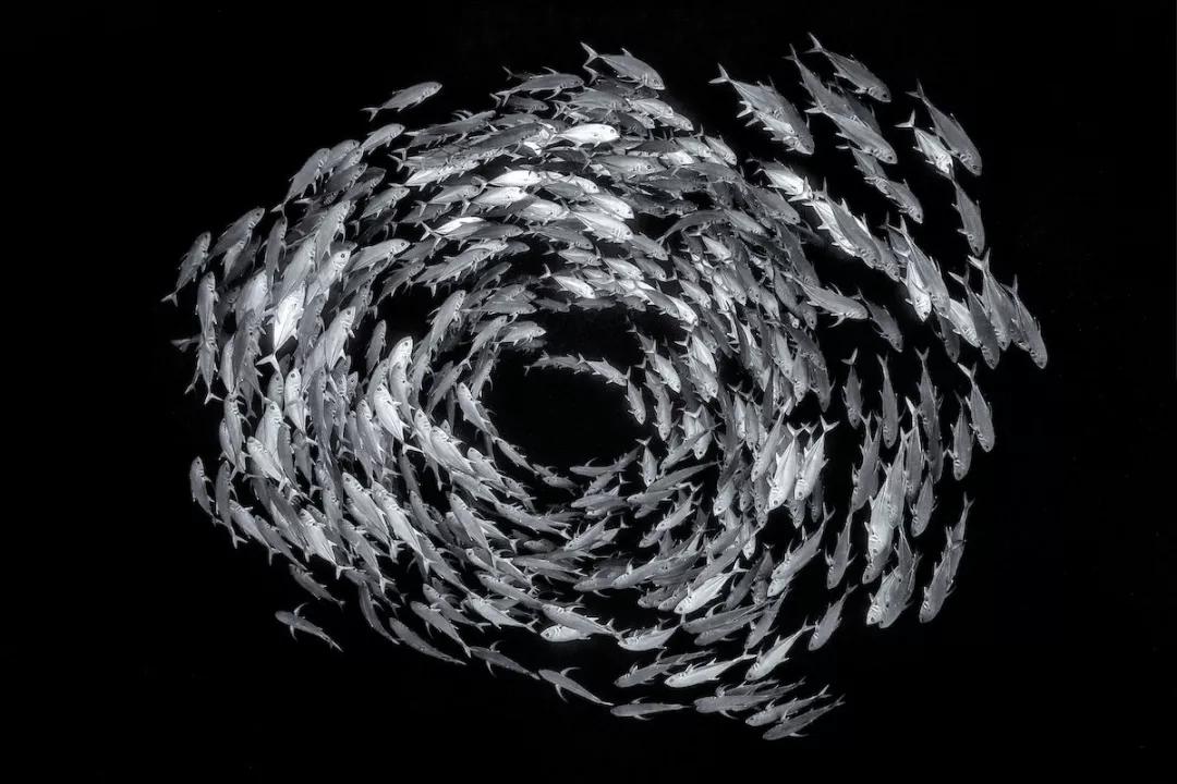 一大群六帶鲹在水里組成了環(huán)狀,它們這一行為是交配前的約會練習,同時還可以威嚇一下潛在捕食者。像這樣的聚會產(chǎn)卵很容易被捕漁者一鍋端,但幸運的是,這群魚生活在紅海禁止捕漁的海洋保護區(qū)域內。
