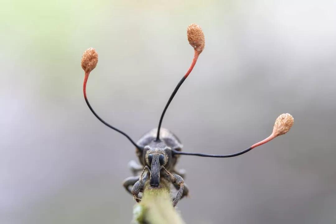 攝影師 Frank 在夜探秘魯亞馬遜熱帶雨林時,發(fā)現(xiàn)了這只緊緊抓著蕨類植物根部,長相奇異的象鼻蟲。它呆滯的眼睛顯示著它已經(jīng)死亡了,而從它軀干上長出的三根觸角一樣的東西則是一種寄生在象鼻蟲身上的真菌。