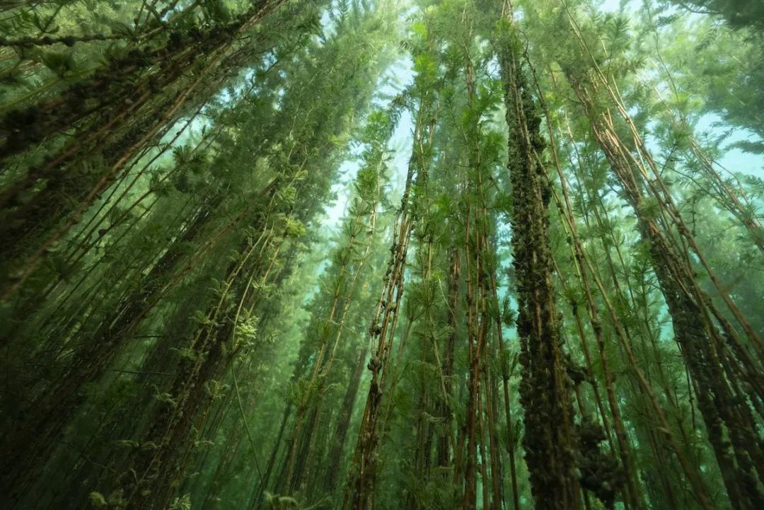 在他貼著水面游動的時候,他突然發(fā)現(xiàn)一個巨大的長矛消失在下面的雜草中。他向下游去,游近了才發(fā)現(xiàn)自己仿佛置身于一個水下叢林中, Michel 用廣角構圖的方式營造出一種置身于參天大樹的森林中,從地面向上凝視的感覺。