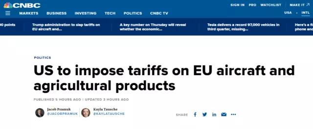 近日,美國(guó)政府對(duì)歐洲多類產(chǎn)品征收25%的關(guān)稅,共計(jì)征收75億美元(相當(dāng)于69億歐元,在WTO歷史上創(chuàng)紀(jì)錄的)的新關(guān)稅。以報(bào)復(fù)波音公司和空客公司之間的爭(zhēng)端,并稱這是對(duì)歐洲對(duì)空客補(bǔ)貼長(zhǎng)期貿(mào)易戰(zhàn)的回應(yīng)。
