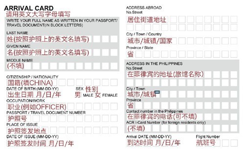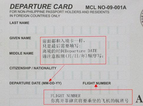 中國(guó)公民在結(jié)束菲律賓觀光旅游,于機(jī)場(chǎng)辦理出境登機(jī)手續(xù)前,應(yīng)先交納機(jī)場(chǎng)稅,然后到訂購(gòu)返機(jī)票的航空公司柜臺(tái)前辦理出境登機(jī)手續(xù),領(lǐng)取登機(jī)卡和行李卡,同時(shí)向航空公司工作人員遞交出境卡。出境卡的填寫(xiě)內(nèi)容同入境卡基本相同。