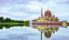 粉紅清真寺+首相署+太子城廣場(chǎng)】仿造摩洛哥卡薩布蘭卡的哈桑清真寺而建,坐落在馬來西亞的新行政中心-太子城,占地面積5.5公頃,耗資1000萬美元,是馬來西亞最大的清真寺,同時(shí)也是東南亞地區(qū)最大的水上清真寺。