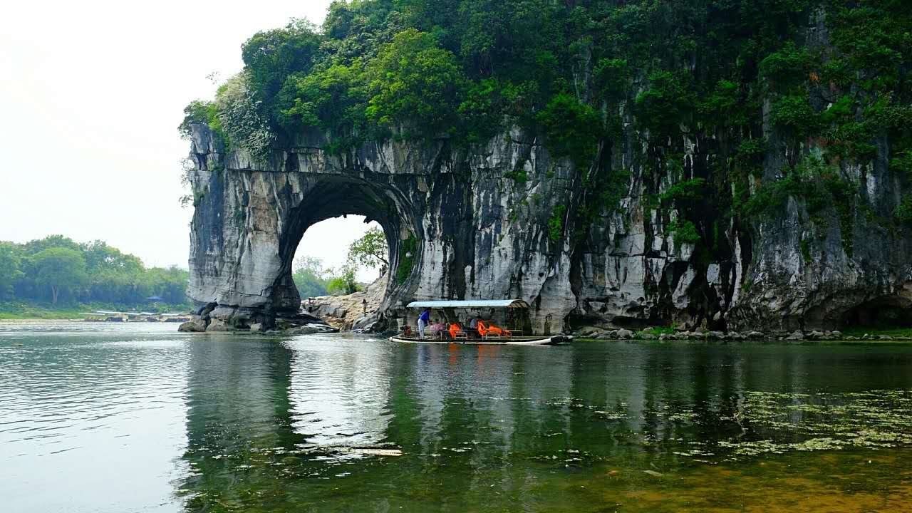 游覽【象鼻山】象鼻山是桂林的城徽山,是桂林旅游的標(biāo)志山,它坐落在桂林市中心的漓江與桃花江匯流處,形似一頭鼻子伸進(jìn)漓江飲水的巨象,象鼻和象腿之間是面積約一百五十平米的圓洞,江水穿洞而過,如明月浮水。坐落西岸的象山水月與漓江東岸的穿月巖相對(duì),一掛于天一浮于水,形成"漓江雙月"的奇特景觀。