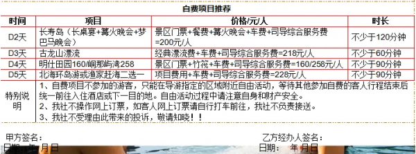 1.乙方特別提醒甲方,乙方所推薦的另行付費旅游項目,不一定適合所有旅游者參加。請甲方根據(jù)自身情況以及需求, 在“自愿自費”的前提下選擇參加,乙方不得以任何理由強迫甲方參加。