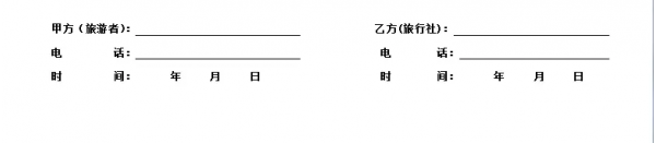 四、本協(xié)議一式二份,雙方各執(zhí)一份,受組團社及地接社委托該團導(dǎo)游為乙方授權(quán)簽字代表,甲方為旅游者本人(18周歲以下未成年人需監(jiān)護人簽名)。雙方同意本協(xié)議以雙方簽字即生效。