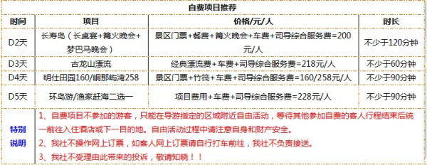 1、長(zhǎng)壽島為增項(xiàng)自理項(xiàng)目,不參加的游客 ,只能在景區(qū)附近自由活動(dòng) ,等待其他客人行程結(jié)束后, 再乘車返回酒店 , 晚餐自理 ,敬請(qǐng)知曉。
