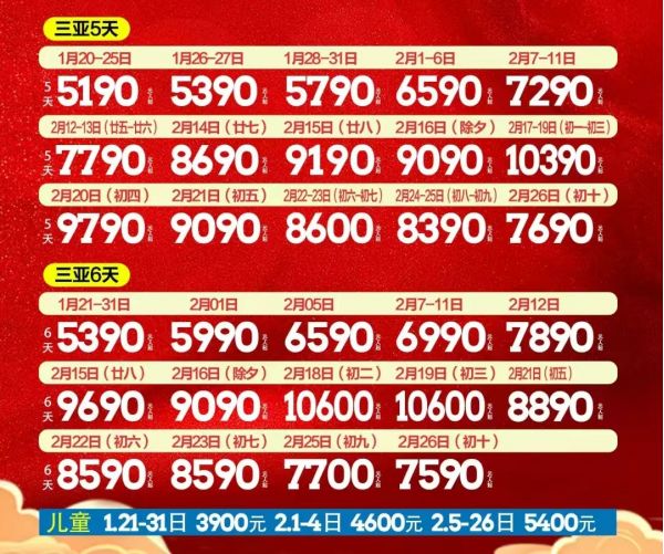 出團(tuán)日期:五天:1月20-25日1月26-27日1月28-31日2月1-6日2月7-11日?2月12-13日(五-)2月14日(廿七)2月15日(廿八)2月16日(除夕)2月17-19日(初一初三)?2月20日(初四)2月21日(初五)2月22-23日(初六一初七)2月24-25日(初八一初九)2月26日(初十)? 六天:1月21-31日2月01日2月05日2月7-11日2月12日2月15日(廿八)2月16日(除夕)2月18日(初二)2月19日(初三)2月21日(初五)2月22日(初六)2月23日(初七)2月25日(初九)2月26日(初十)