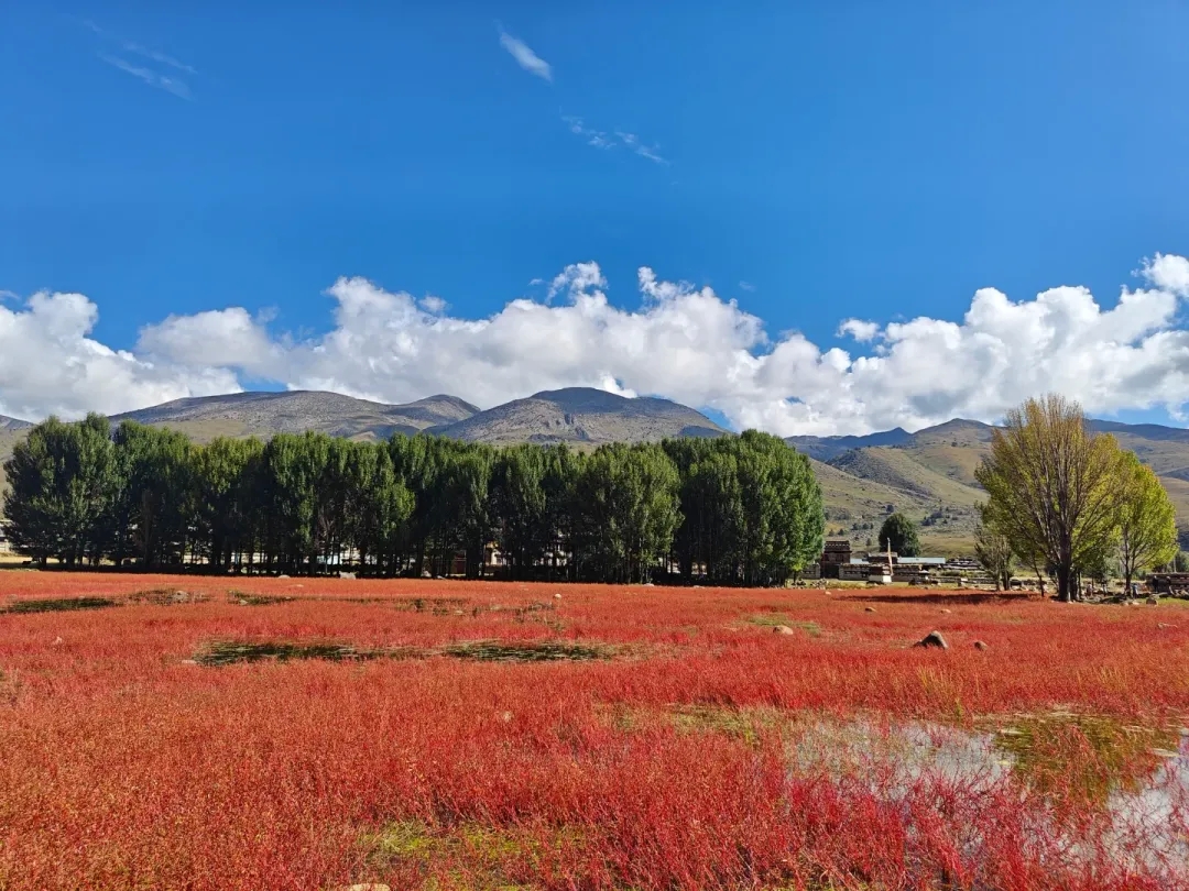 后乘車經(jīng)桑堆鎮(zhèn)【紅草地】(注:紅草地為季節(jié)性景觀,只有在每年的9月底到10月初才能看到此處的草原呈紅色),在秋天的時(shí)候,配合上后面泛黃的樺樹(shù),倒映在水塘中,是許多書(shū)上所介紹的美景。之后翻越古冰川遺跡海子山到達(dá)理塘。