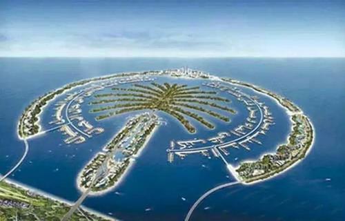 2、人造棕櫚島:從高空俯瞰迪拜(游客自費乘坐直升飛機(jī)),依稀可見兩棵巨大的棕櫚 樹漂浮在蔚藍(lán)色的海面上,仔細(xì)辨認(rèn),棕櫚樹竟是由一些錯落有致、大大小小的島嶼 組成的世界上最大的人工島;