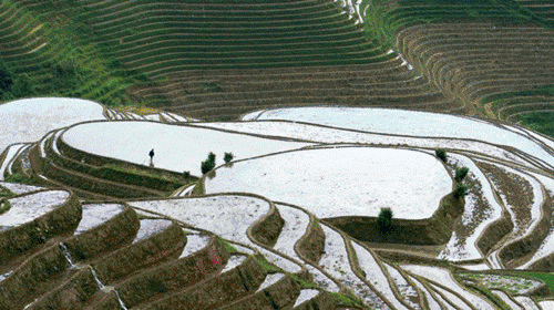 隨著朝陽逐漸爬上藍(lán)天,梯田中濃濃的水汽也慢慢化開,像是一滴白滴入了金的底色,在這精致的春景中一點點地蔓延開來,飄飄欲仙,美如仙境;