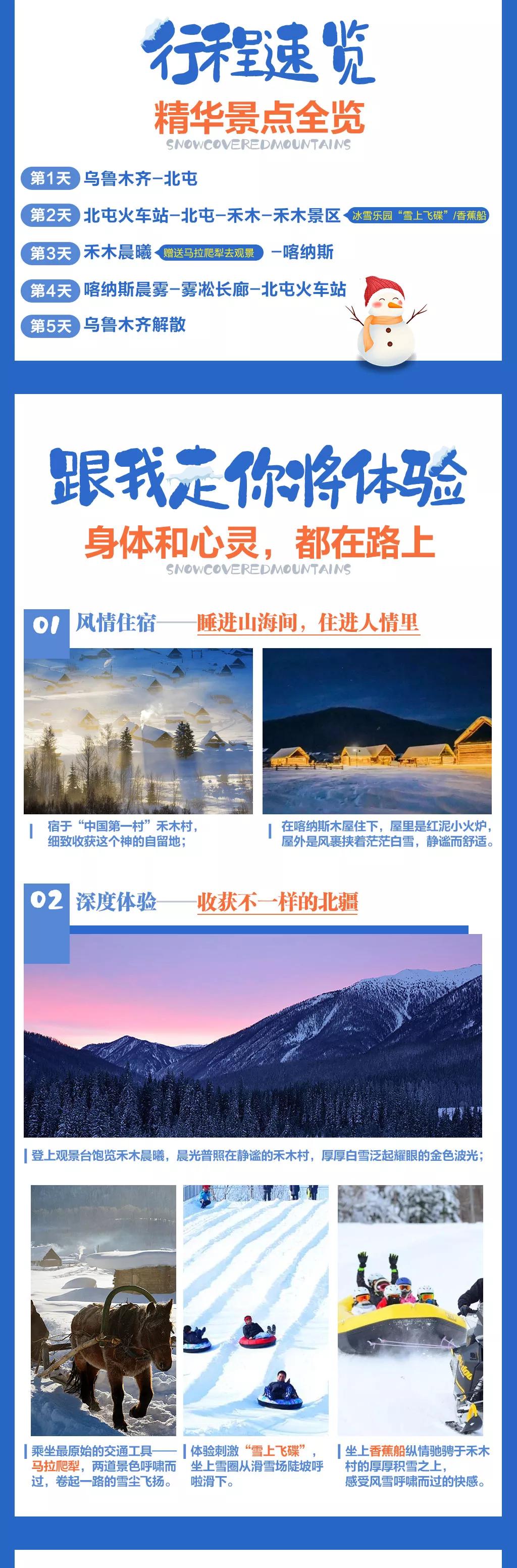 4. 贈(zèng)送禾木村冰雪樂(lè)園中的滑雪或香薰船體驗(yàn),如游客想?yún)⒓悠渌鼕蕵?lè)項(xiàng)目費(fèi)用敬請(qǐng)自理。