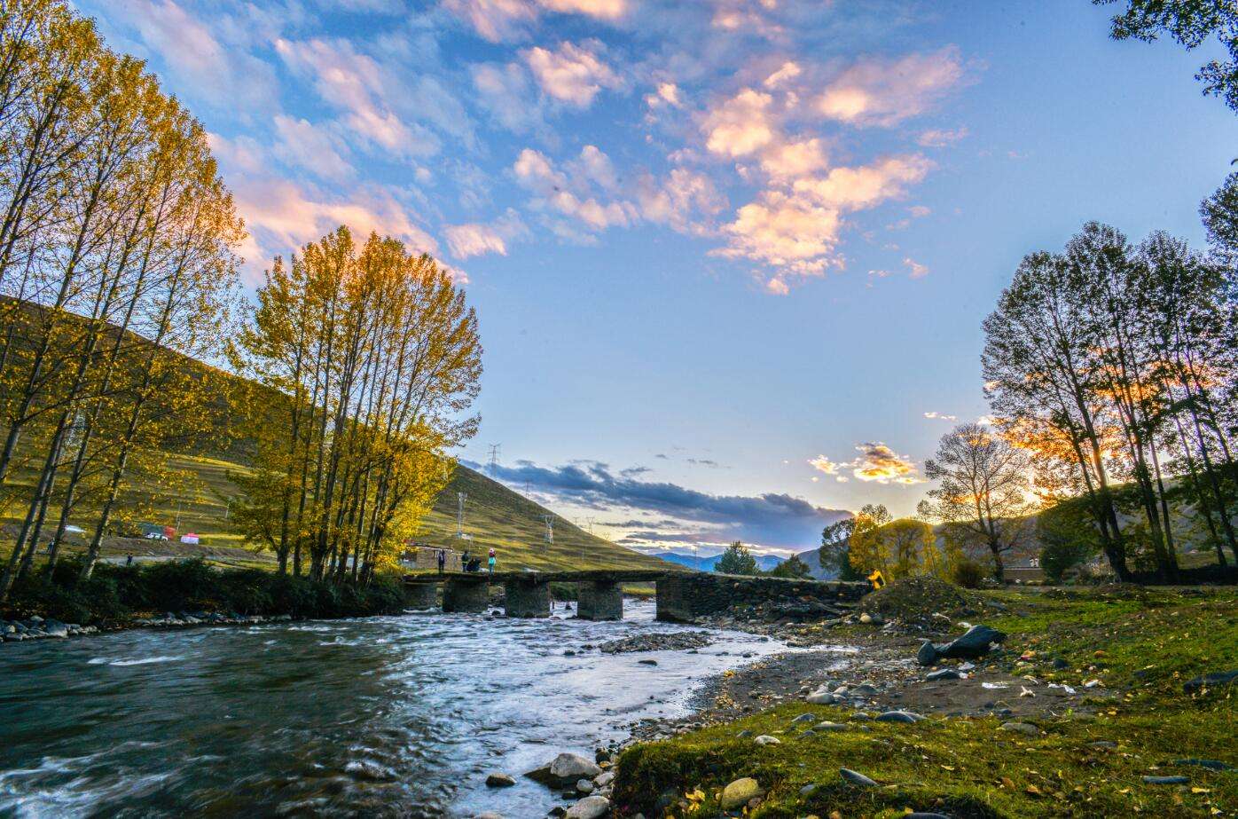 清澈的江水流過開滿野花的草地,風中送著自然的氣息,