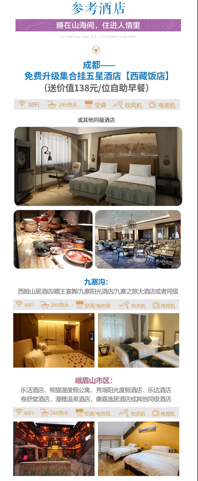 ? 住宿:含全程5晚舒適酒店標(biāo)間,免費(fèi)升級2晚成都集合掛五酒店(西藏飯店)。參考酒店如下: