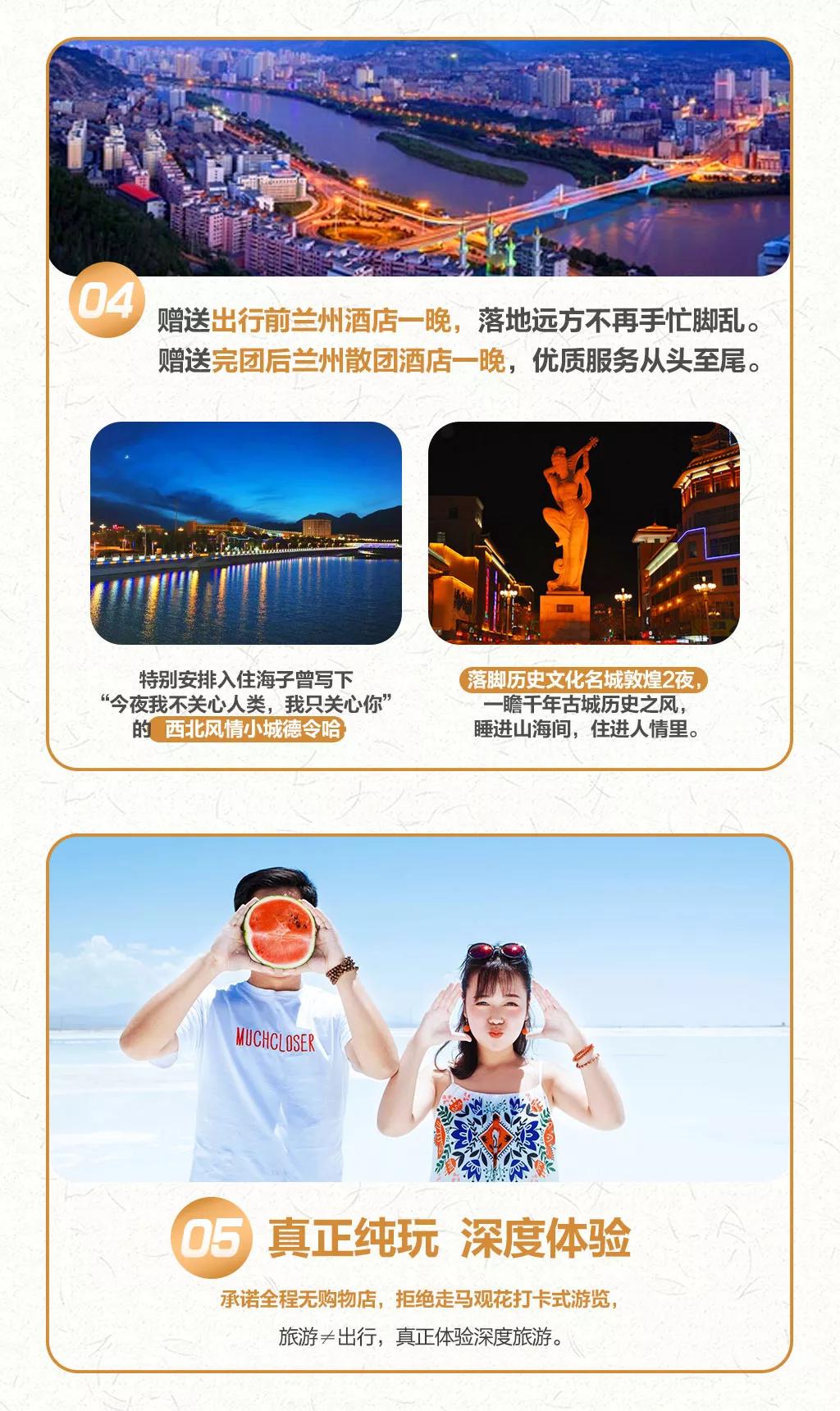 1. 敦煌莫高窟景區(qū)自2015年6月起實(shí)行數(shù)字展示中心數(shù)字洞窟展示和莫高窟實(shí)體洞窟體驗(yàn)的預(yù)約參觀模式,每天限6000人參觀,團(tuán)隊(duì)參觀時(shí)間嚴(yán)格按照莫高窟預(yù)約場(chǎng)次進(jìn)行,因此,敦煌段景點(diǎn)參觀順序會(huì)根據(jù)莫高窟時(shí)間進(jìn)行調(diào)整或同團(tuán)客人安排不同時(shí)間游覽,敬請(qǐng)配合。