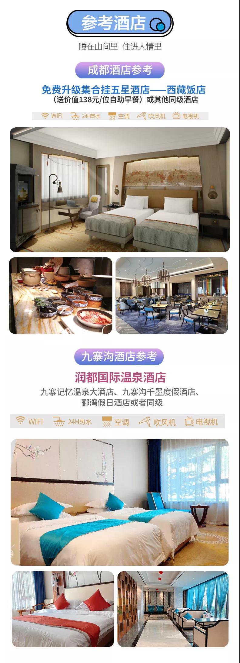 3.住宿:含全程3晚住宿;免費(fèi)升級(jí)1晚成都掛五星酒店西藏飯店,贈(zèng)送價(jià)值138元/位自助早餐。參考酒店如下: