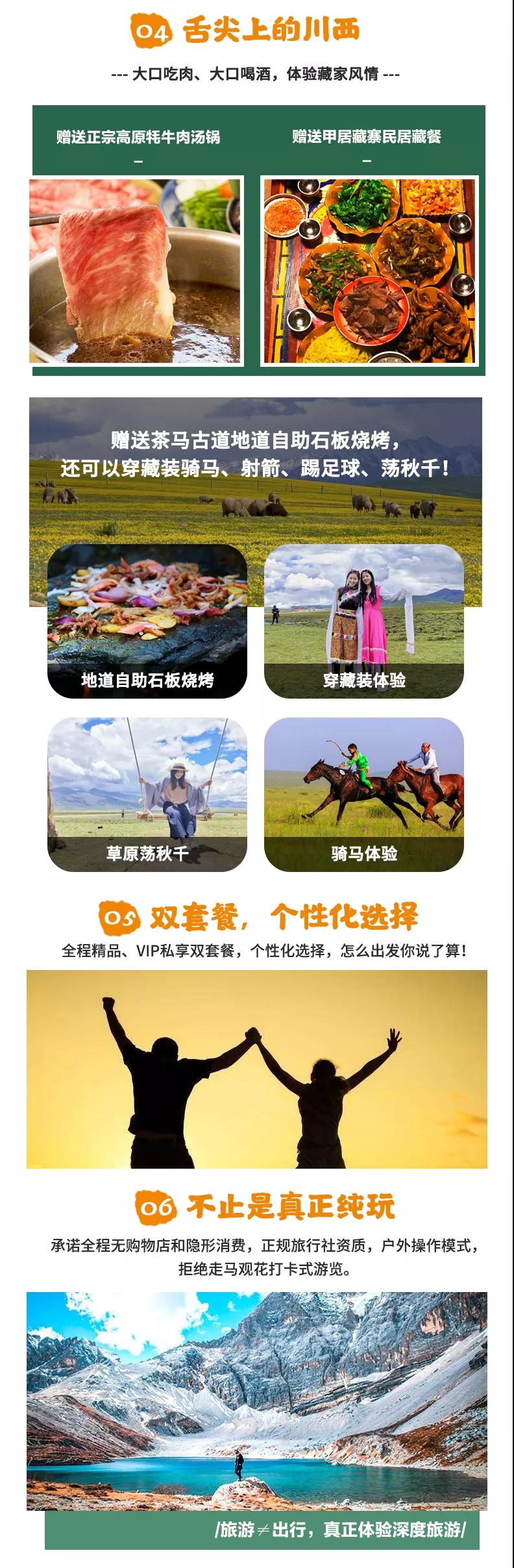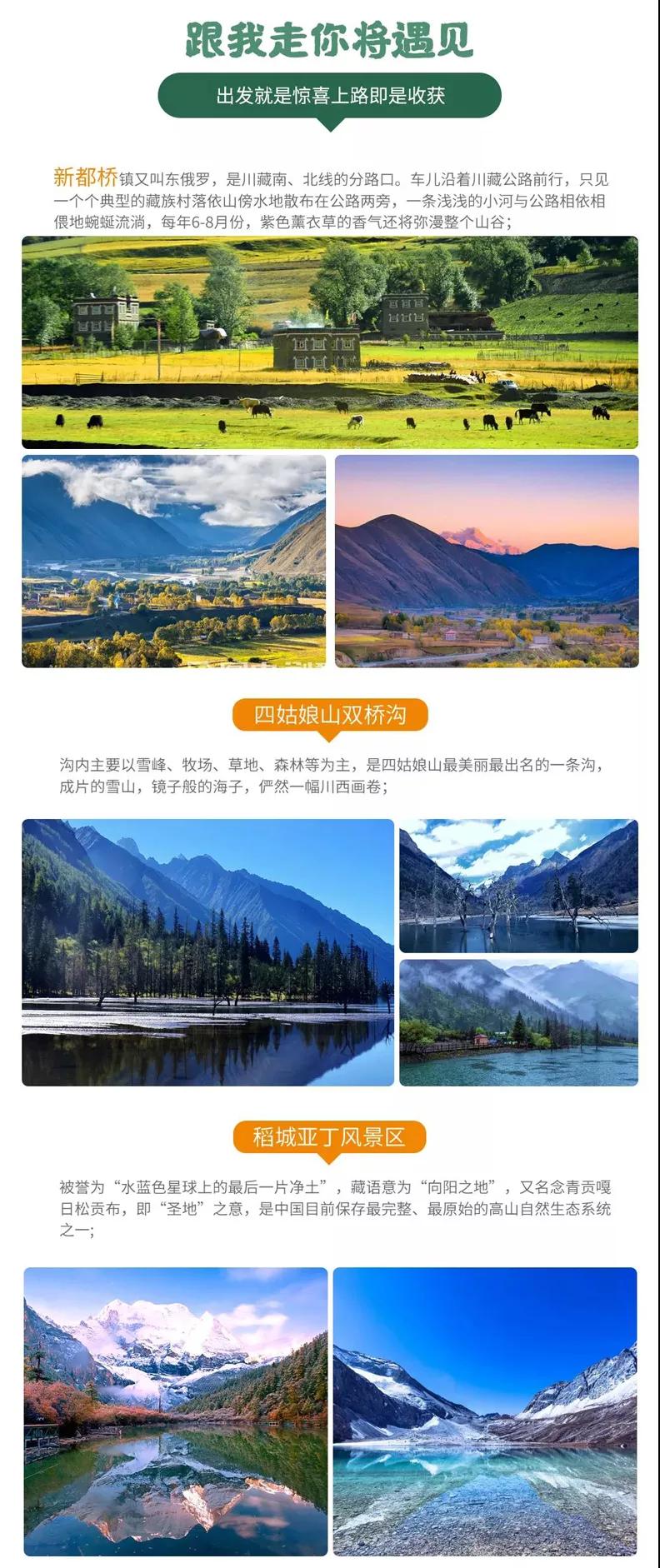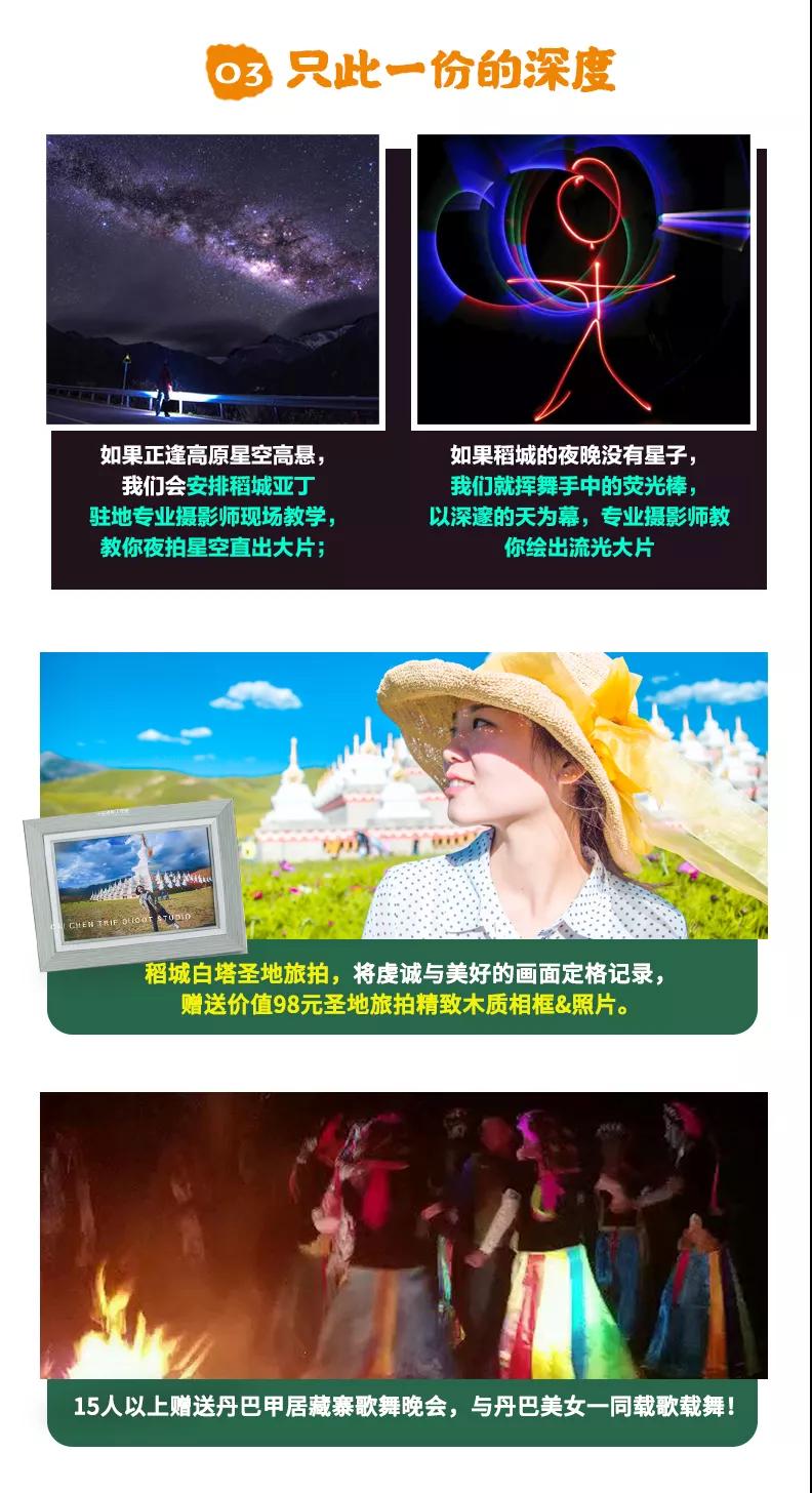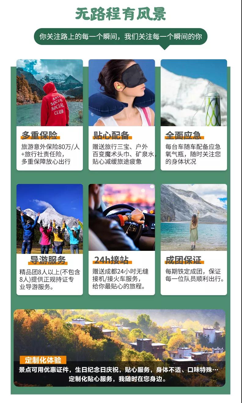 贈送:特色贈送甲居藏寨藏家晚餐、高原特色牦牛湯鍋、理塘茶馬古道自助石板燒烤;贈送旅游三寶、魔術(shù)頭巾、礦泉水緩解旅途疲勞;贈送價值98元圣地旅拍精致木質(zhì)相框&照片;贈送稻城專業(yè)攝影師現(xiàn)場教學夜拍星空直出大片,沒有星星時則教拍流光大片;15人以上贈送甲居藏寨篝火晚會;贈送成都市區(qū)24小時接機/接火車服務;贈送項目不用不退。