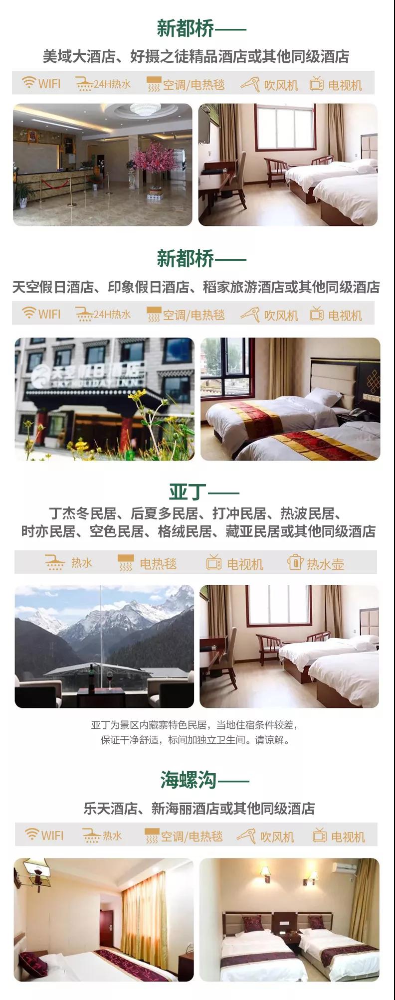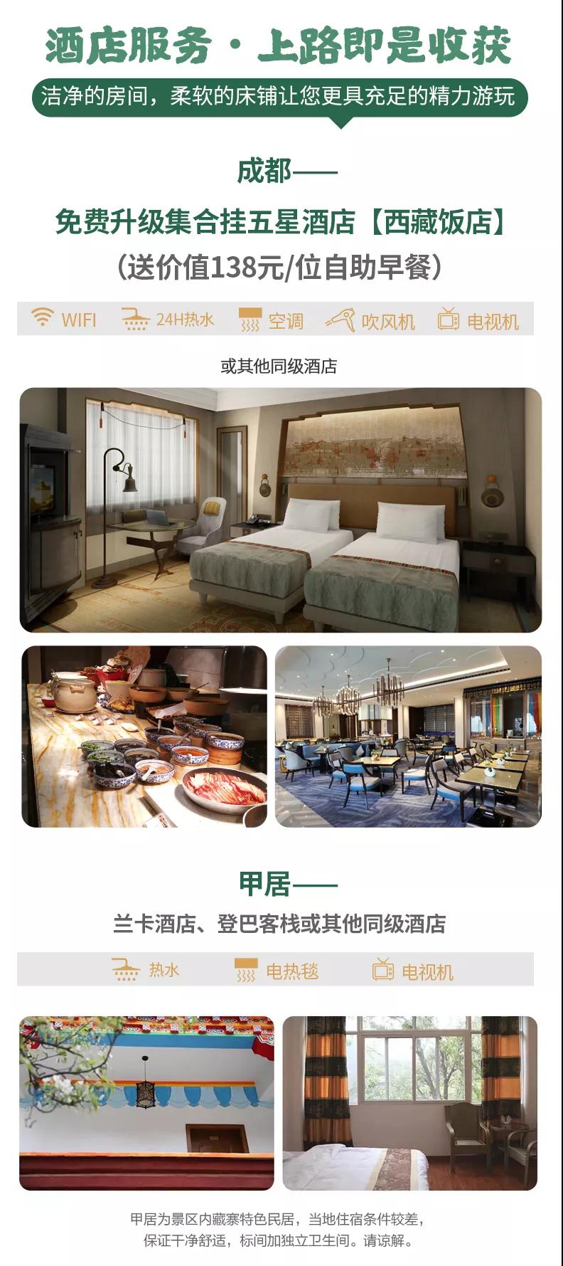 住宿:6晚當?shù)鼐肪频觌p人標間+免費升級一晚成都集合掛五酒店雙人標間,確保酒店干凈衛(wèi)生,溫馨舒適。因沿途高原藏區(qū)條件有限,如果酒店設施沒有達到您的期望,敬請諒解。參考酒店如下: