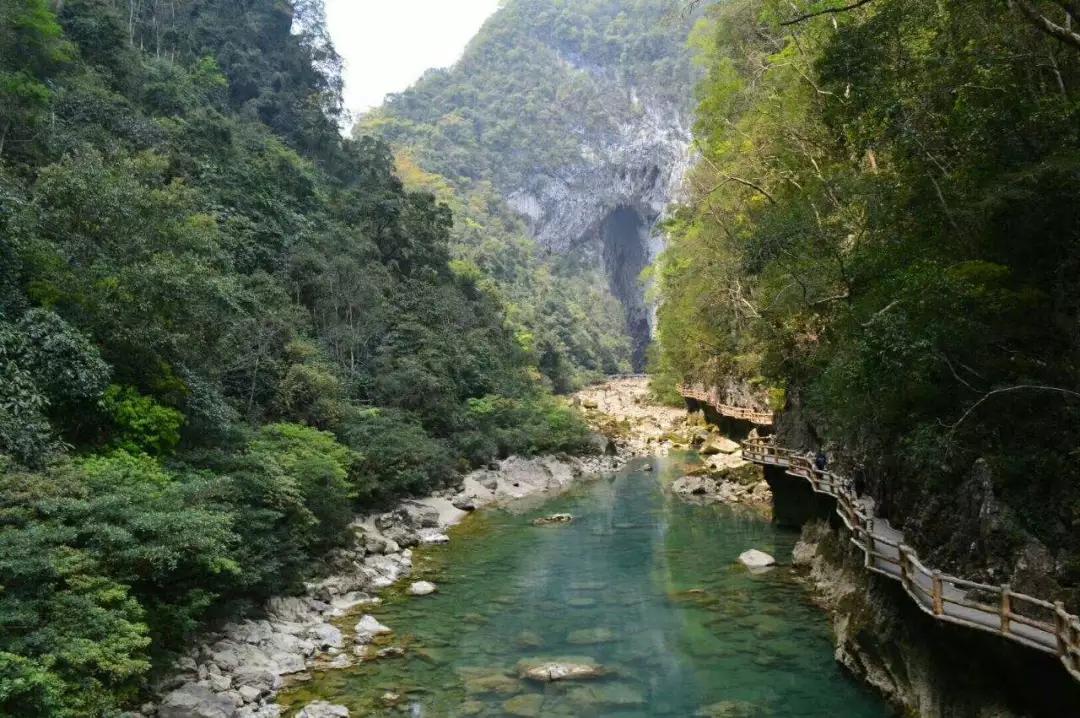 下午:后乘車前往游覽國家AAAAA級(jí)景區(qū)【大七孔】(游玩時(shí)間不少于2小時(shí));大七孔是以原始森林、峽谷、伏流、地下湖為主體的景區(qū),沿著恐怖峽打狗河直下,可見吊橋,右邊的棧道一面靠山,一邊臨水,蜿蜒曲折,凹凸不平。最為震撼的還是走過棧道的三分之二處,有一橫跨河兩岸的天然巨巖,是喀斯特是貌奇觀之一,俗稱天生橋,被專家們譽(yù)為“大自然神力所塑的東方凱旋門”,仰觀橋孔下,只見巨型鐘乳懸掛,橋腳、橋側(cè)的裂隙石縫長(zhǎng)出綠石草叢灌木,藤蘿花卉纏裹橋身,真是滿目琳瑯、五顏六色的天然大彩橋。