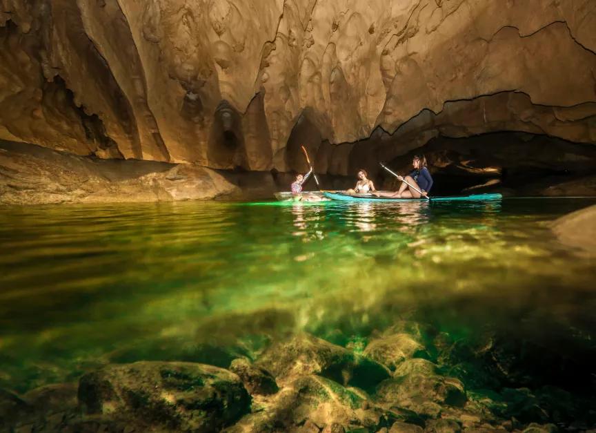 洞內(nèi)部保存完好,帶上頭盔頭燈你就是最酷的探險(xiǎn)家,頭燈所照到之處一步一景,在這里有鐘乳石發(fā)育廳,你可以近距離看到億萬年滴水所形成的鐘乳石;跨越億萬年時(shí)空的相遇,發(fā)現(xiàn)古老神秘的生物化石;還可以看到不停被水沖刷后形成的蓮花池;以及清澈見底,仿若深藍(lán)之眼的暗河,泛一艘透明玻璃船在水上是一種什么體驗(yàn)?