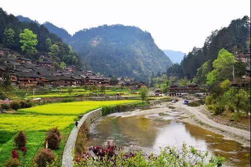 這是一個有百戶人家的苗族村寨 故名。寨內苗民的服飾以長裙為特征,所以又稱為"長裙苗"。木吊腳樓建筑外,還可以欣賞到寨民表演的攔路酒歌、盛裝苗舞、蘆笙舞、八抬蘆笙舞等等節(jié)目。 村寨背山面水,古木參天。
