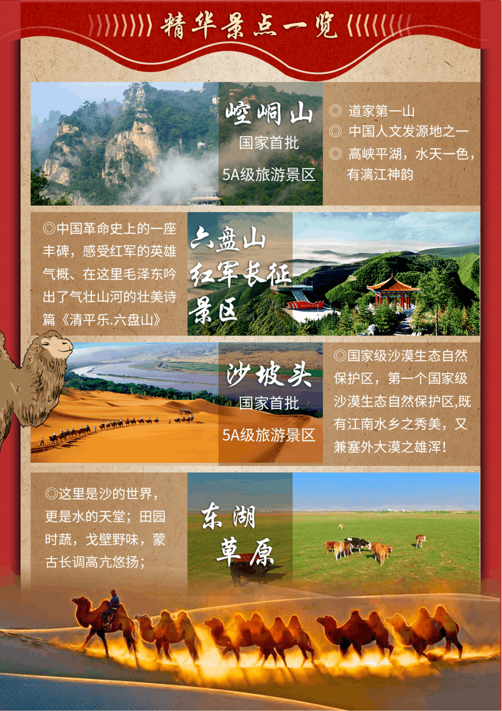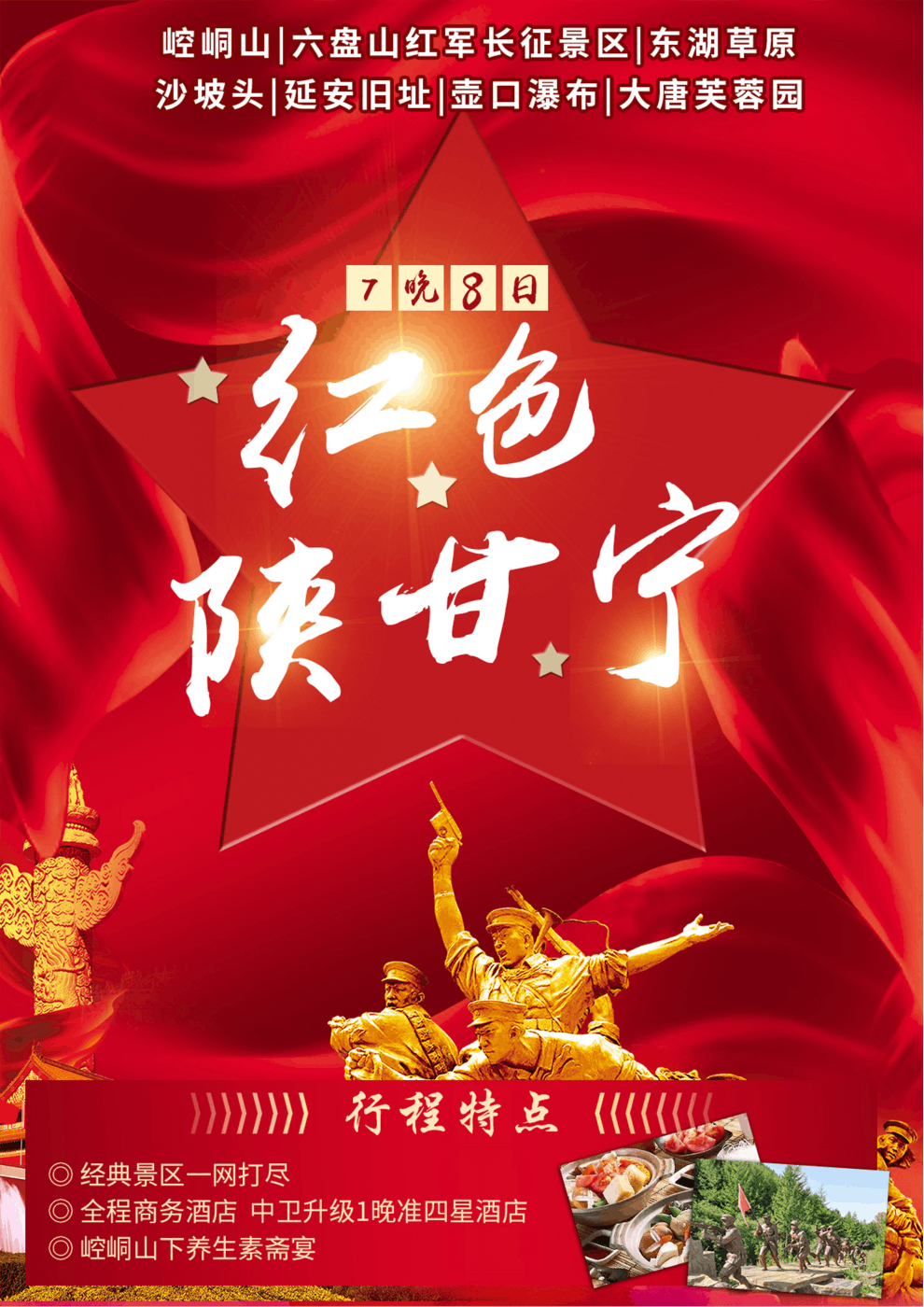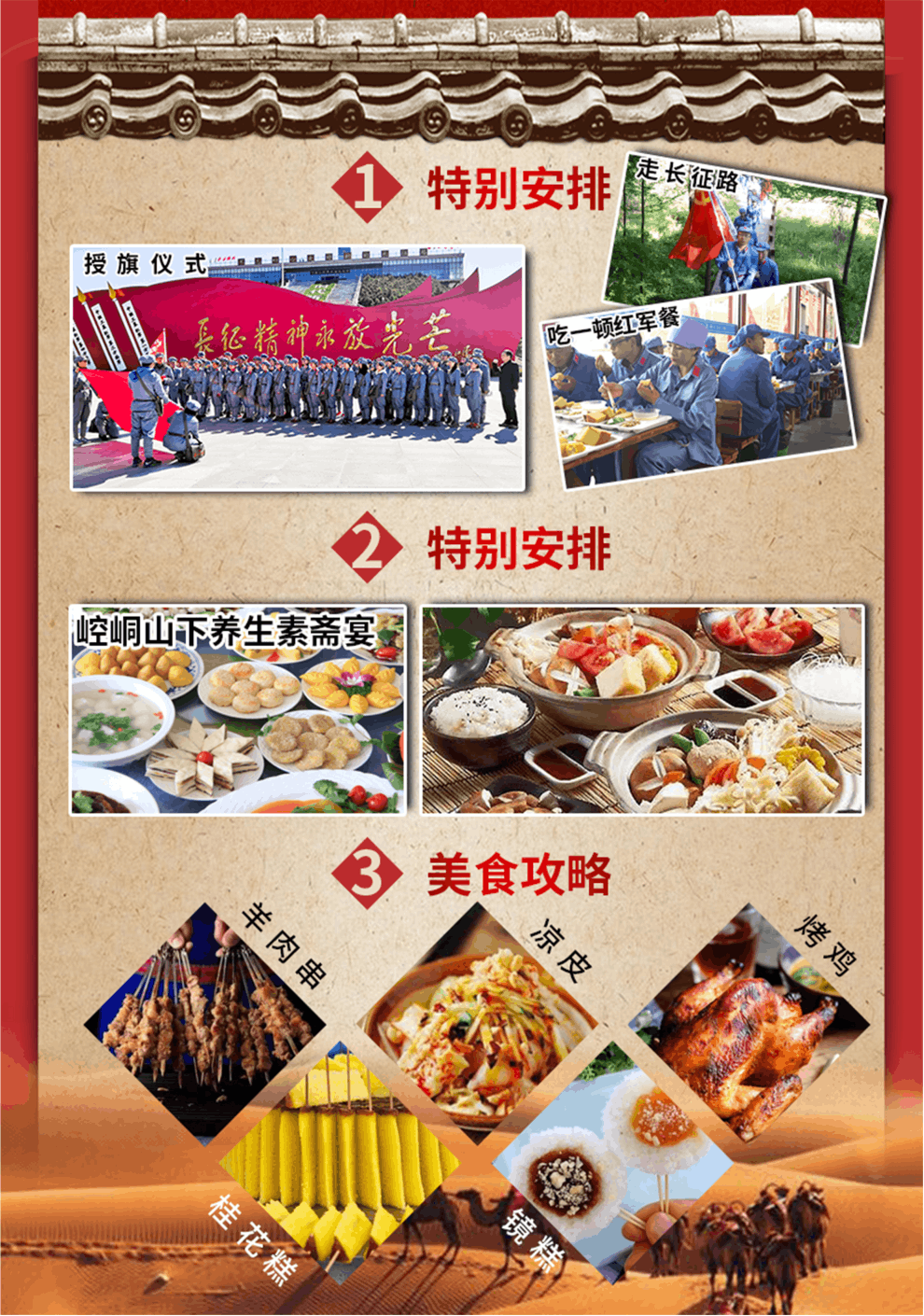 特別安排:【授旗儀式】—到達(dá)景區(qū),換上紅軍服裝,按照長征中紅一、紅二、紅四方面軍的編制,分為三隊。由活動領(lǐng)隊致辭,向各隊隊長授旗!大家齊聲朗誦《清平樂.六盤山》,伴著“不到長城非好漢”的壯志豪情,高舉紅軍旗,身著紅軍服向山頂進(jìn)發(fā)。