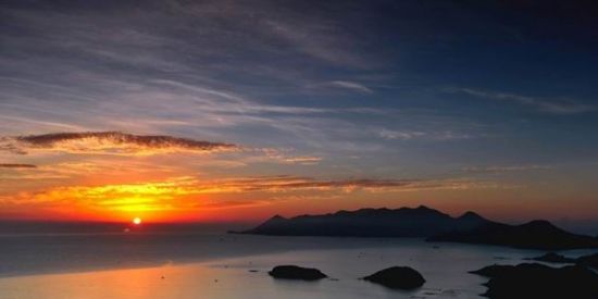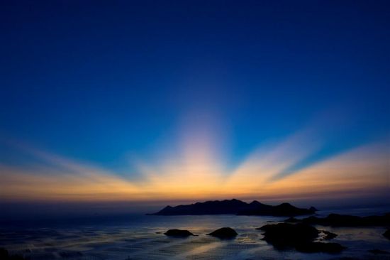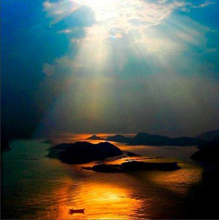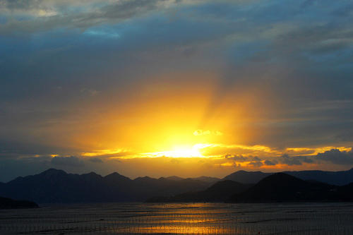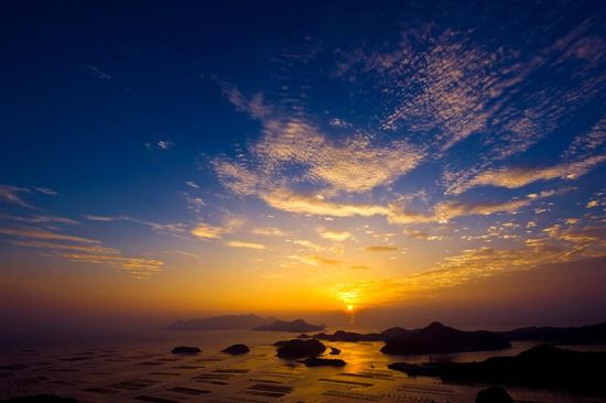 花竹是攝影者眼中的圣地。站在觀景臺,居高臨下,眼睛所及是海的遼闊,山的壯美。開始,天空是純凈的藍(lán)色,中間一道金色的光帶把天和海分隔開來;漸漸地,金色的光帶暈染開來,越抹越寬。最后,太陽積蓄了他所有的力量,騰地一下躍出了海面。頓時,萬丈霞光,給天空披上七彩霓裳。陽光灑在海面,海水變成金黃色,艷得耀目。