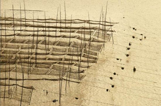拍攝貼士:北岐的拍攝點(diǎn)位于高高的山崖邊,視野十分開闊,遠(yuǎn)處有山,緊挨著腳下的山崖就是灘涂和紫菜架。一排排環(huán)形的向?qū)γ婺亲吒叩暮u聚集。日出的方向,紫菜排之間有明顯的環(huán)形灣道,當(dāng)有適時的光線和漁船出現(xiàn)時,將十分完美。北岐的灘涂是著名的虎皮沙灘,只要有光線,很容易反射出金色的紋理和蜿蜒的小溪。因?yàn)檫@里是拍攝大點(diǎn),很容易請到當(dāng)?shù)貪O民做攝模,所以200以上的長焦也很重要,且要時刻準(zhǔn)備好抓拍。如果想拍些不一樣的角度,可通過那條山道向后走,還可以一直下到沙灘上,沙灘離紫菜排很近,可以拍到不同尋常的紫菜養(yǎng)殖場景。沙灘上還有很多結(jié)滿了硬硬的牡蠣殼的礁石,側(cè)逆光中可以拍到浪潮拍案中海岸。從停車的地方也可以下灘涂,有個小碼頭,近岸邊經(jīng)常??坎簧僬谘b卸貨的漁船,和已經(jīng)被廢棄的舊船。就靠你的創(chuàng)作靈感來發(fā)揮了。運(yùn)氣好,灘涂上面還有勞作的人們和飛翔的白鷺。