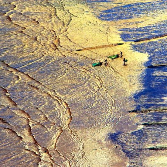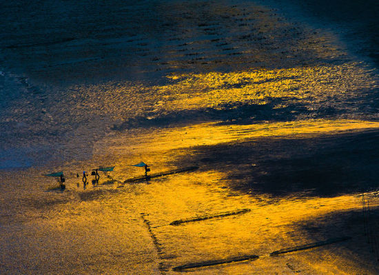 小皓海灘風(fēng)光也是灘涂風(fēng)光最經(jīng)典的拍攝點(diǎn),主要拍攝順、逆光沙質(zhì)灘涂和海上種養(yǎng)、撈魚苗等勞作場面。小皓以沙質(zhì)灘涂為主,順光能看到山下那一塊塊巨大的金黃灘涂隨波而變,逆光觀賞,一條條從沙灘上流淌過的溪水,化做蜿蜓曲折的灘涂動脈,閃爍著迷人的銀色光芒。